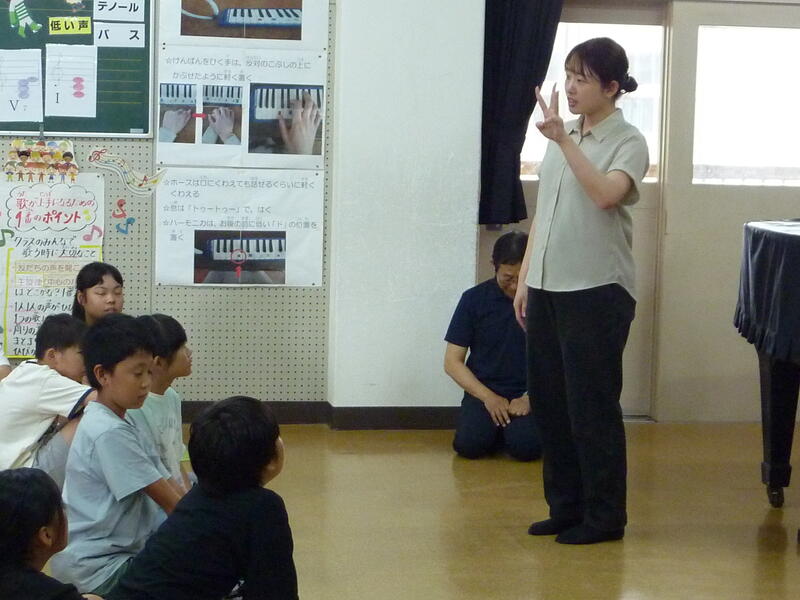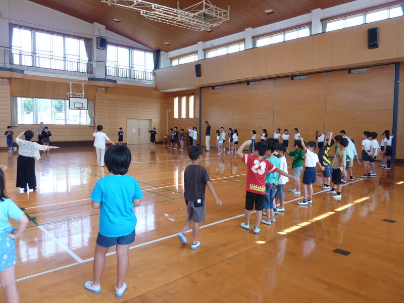 南関町婦人会会長の釘崎さんから、「『ぎおんさん』で子供たちに踊ってもらえないか」との依頼を受け、3年生以上で練習することにしました。練習の指導には、釘崎さん、田中さん、田端さんの3名が来られ、体育館で指導をしてくださいました。