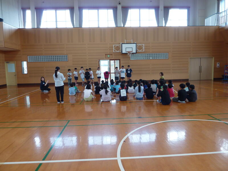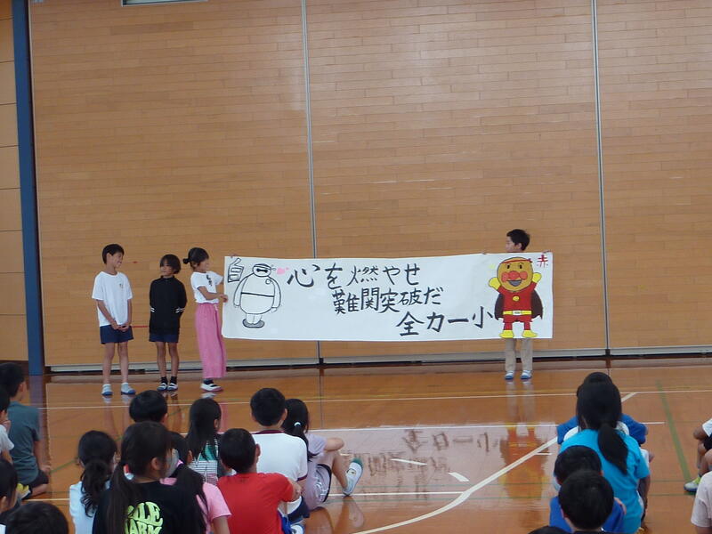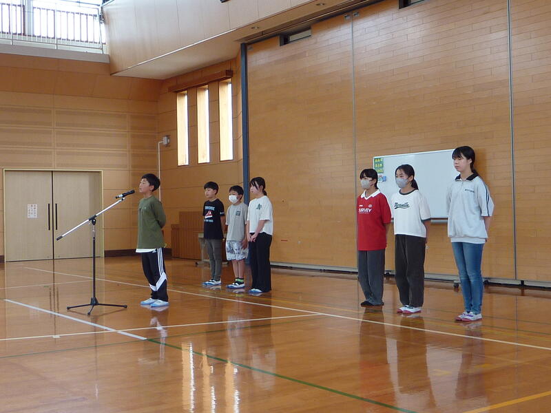 5月15日(木)に運動会の結団式を行いました。最初に、総務委員会より今年のスローガンの紹介がありました。次の赤白団長の紹介、そして、体育館と音楽室に分かれて結団式を行いました。