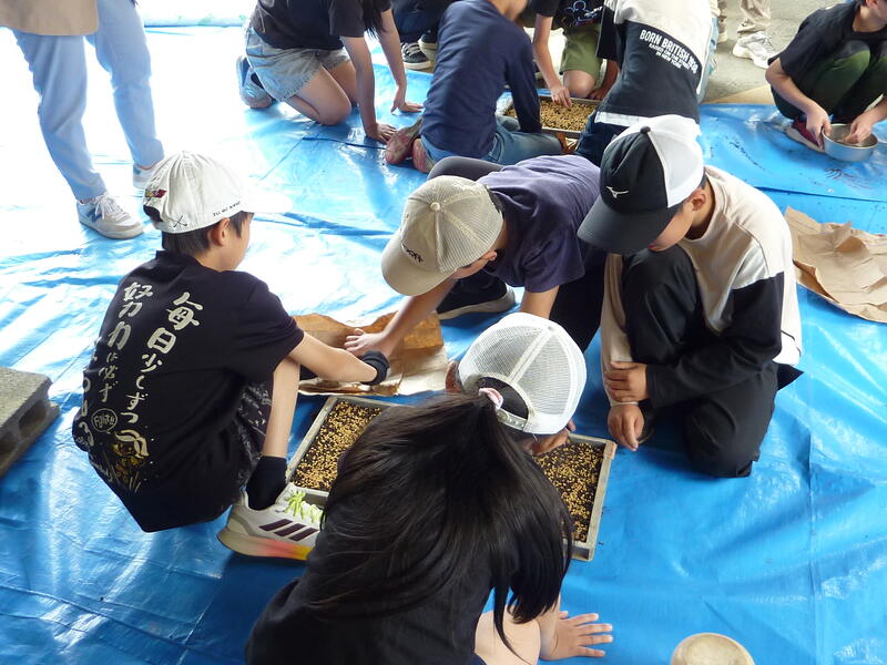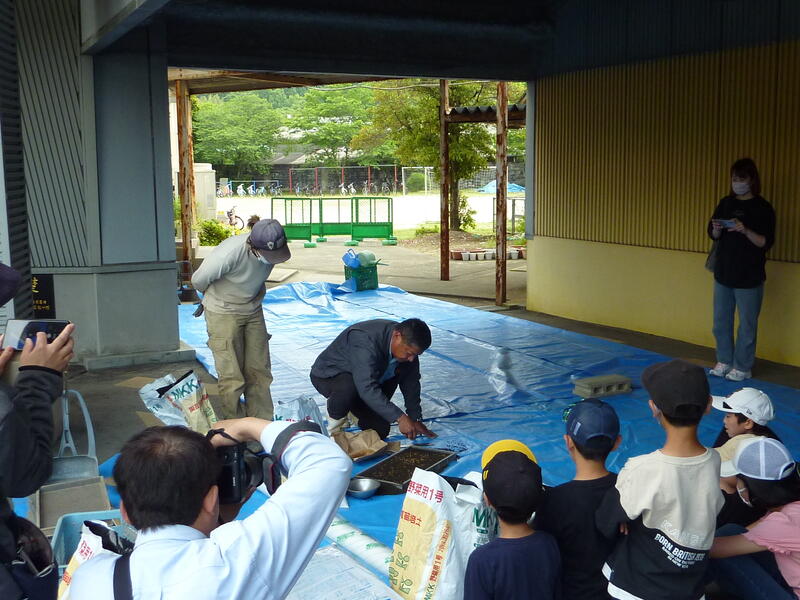 5月12日(月)の5時間目、原農場の原さんのご指導の下、5年生が種籾まきを行いました。原さん他お手伝いしてくださる方もお見えになり、5年生の保護者の方も多数お手伝いに来てくださいました。ありがとうございました。