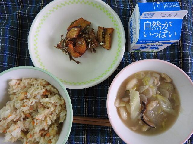 今日は、南関あげご飯、節そうめん汁、なすの中華炒め、納豆、牛乳 64㎉ タンパク質25.6g