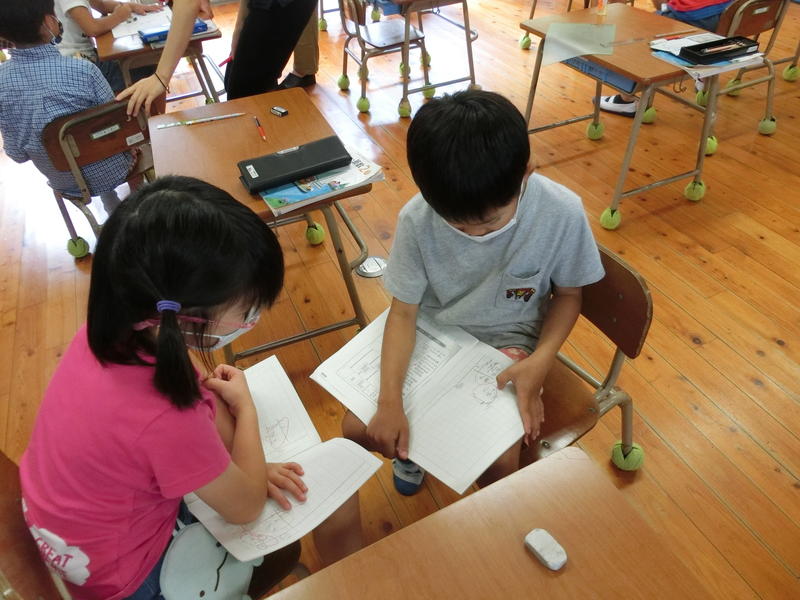 3時間目の2年生とひばり学級(2年生)の学習は、来週予定している1年生との交流会に向けて、自分たちが作った「動くおもちゃ」の説明書づくりでした。それぞれに一生懸命がんばっている姿が見られました。