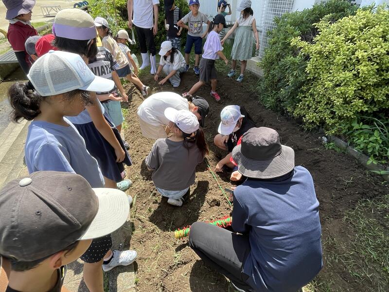 今日の午後から3年生は、丸美屋の芥川様に講師としておいでいただき、大豆のたねまきを行いました。
