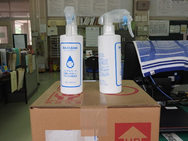 本日、山城産業様より町内の5校に除菌水を寄贈していただきました。アルコール消毒液がなくなりかけていましたので、本当に助かりました。
