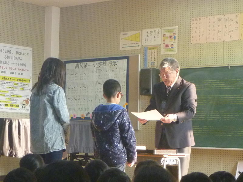 朝の集会は、表彰集会でした。「南からの挑戦状」「町駅伝大会」「玉名荒尾図工美術展」「明るい絵画コンクール」の表彰をしました。