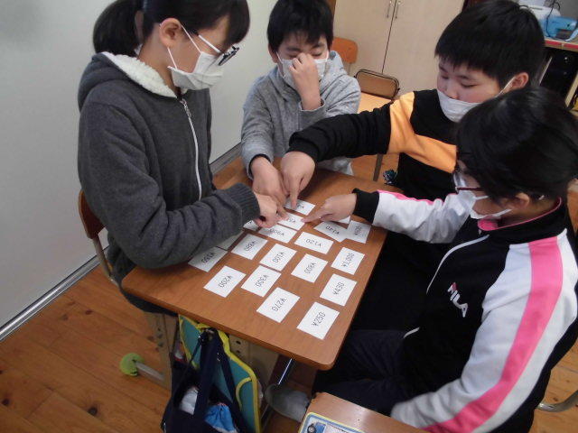 3年生と5年生の様子です。参観した時は、3年生は3ヒントクイズのヒントをグループで考えている場面、5年生は英語専科の先生が英語で言われた数字(お金)のカードを当てる場面でした。