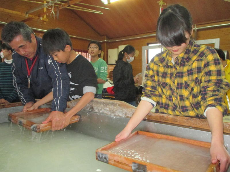 6年生が、三加和公民館敷地内にある「手漉き和紙の館」にて、保存会の皆様のご指導のもと、紙すき体験を行いました。
