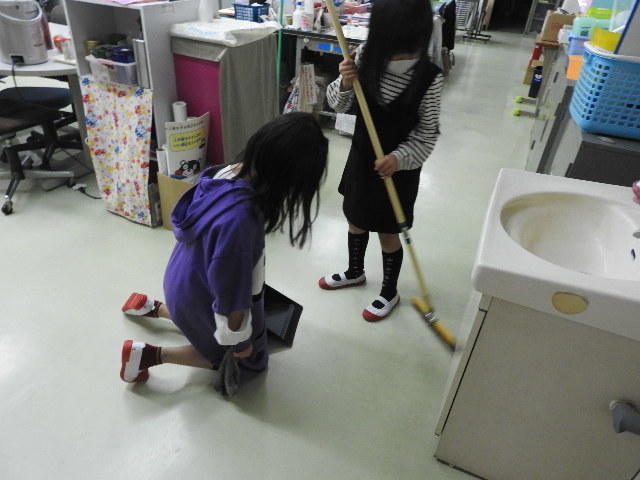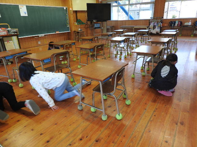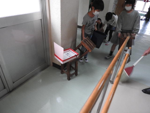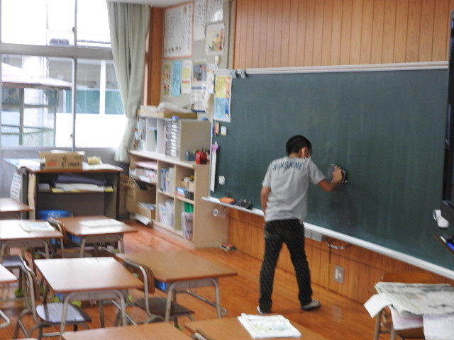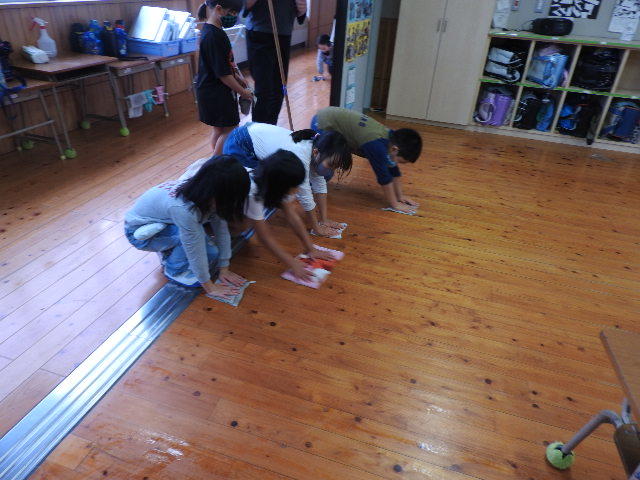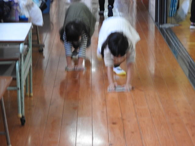 今日の掃除後の時間に、全児童と職員で、机や床、壁についた鉛筆やマジック、絵の具などの汚れを消しました。