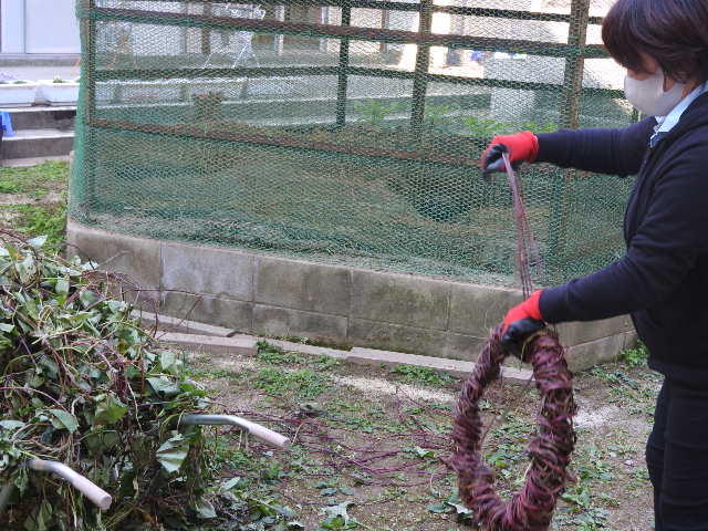 画像は芋のつるを使って、何かを作られている様子です。何ができるか楽しみですね。