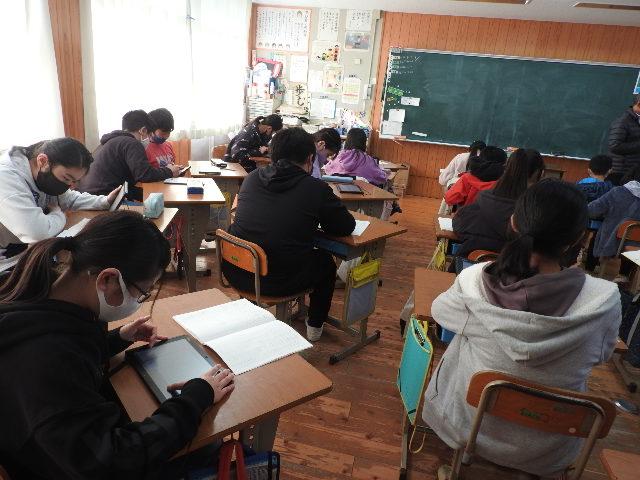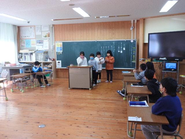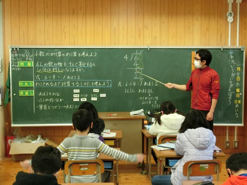 3時間目、4年生教室では、「小数のわり算」の学習が行われていました。一の位でわりきれない時、小数点を付けて、十分の一の位に「0」を付けて解き進める内容でした。子どもたちは真剣に解き方を考え、お互いに教え合う姿が見られました。集中力を持続して取り組む姿に感心しました。