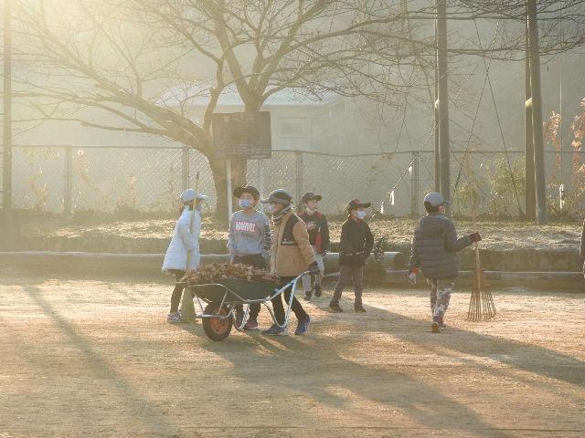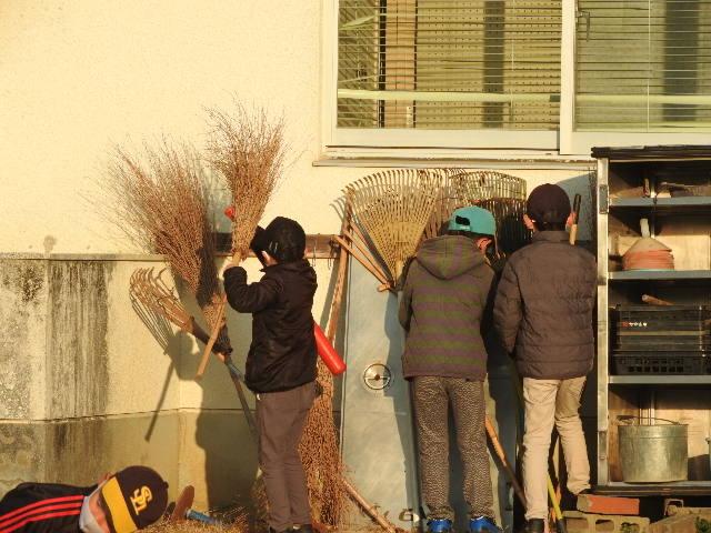 いつも進んで落ち葉拾いをしてくれる3年生。終わった後には道具をきれいに片付けをしてくれます。本当にありがたいです。