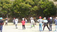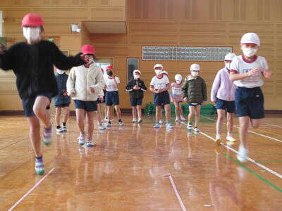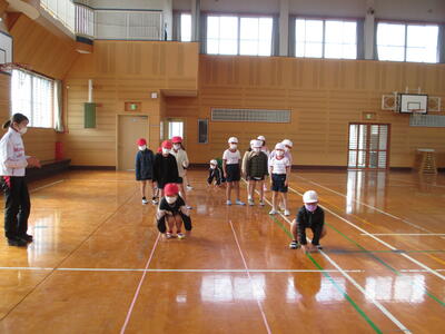 リズムを取る練習もしました。流行りの曲に合わせてジャンプやけんけん跳びをするというもので、これが簡単そうに見えてとても難しく、苦戦中の子どもたちです。みんなで教え合いながら一生懸命頑張っています。