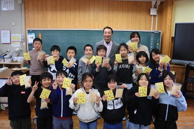 この1年間、福永さんのお力をお借りして大豆の学習をしました。福永さんからは、大豆が調理によっていろいろな姿に形を変えることや、畑の肉といわれる大豆の栄養分のすごさを教えていただきました。そして、栽培から収穫まで、定期的にかかわっていただきました。とてもよい学びができました。その上に、きなこを一人一人いただきました。