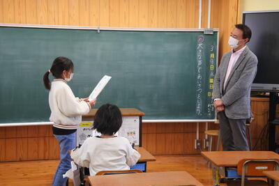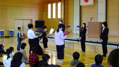3月23日(水)令和3年度の修了式でした。まず、各学年から1名ずつ代表児童が「1年間を振り返って」を発表しました。できるようになったこと、これから頑張りたいことを述べていました。原稿なし発表に挑戦した児童もいました。みんな上手に発表できました。