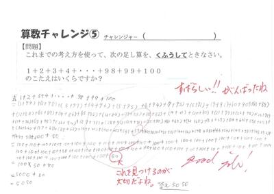 週末には、算数チャレンジ問題を、持ち帰ったタブレットに掲載しています。結構、難問です。あきらめずに挑戦している姿があります。とても感心した答案を紹介します。