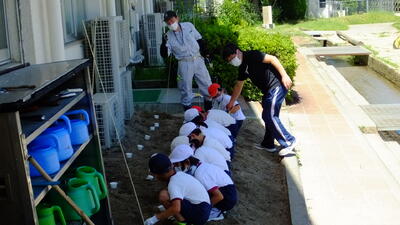 6月29日(水)3年生は、大豆の播種を行いました。指導してくださるのは、丸美屋の福永さんです。福永さんは、大豆がいろいろなものに加工されたり、畑の肉と呼ばれるほど栄養価が高かったりすることから、「大いなる豆が大豆です。」と話されていました。