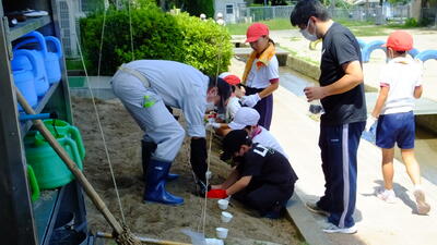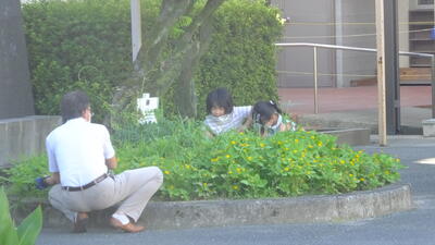 7月1日(金)朝の登校を職員玄関前で迎えている福岡先生が、合間をみて花壇の草取りをしていると、2年生の子が数名手伝いに来ました。