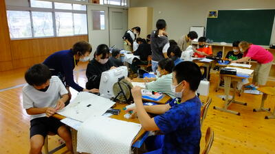 10月17日(月)6年生は、ミシンを使って、ナップザックづくりに挑戦しました。とは言っても、ミシンを使うのは、不慣れです。そこで、婦人会の方に学校応援団として来校していただきました。