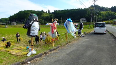 6月にみんなで田植えをした以来、子どもたちが待ちに待った稲刈りでした。休日に、お世話になっている畑まで稲の育ち具合を見に行っていた子どもたちもいました。かかしが、子どもたちを待っているようでした。稲刈りは鎌を使って行いましたが、刈るのがなかなか難しく初めは苦戦していました。