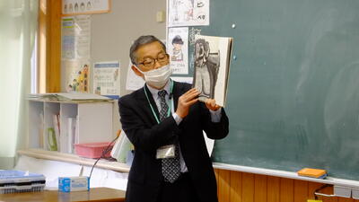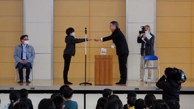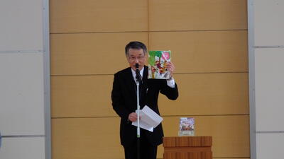 教育長から、郷土の偉人である北原白秋の紹介がありました。次に、マンガ本を児童代表に贈呈していただきました。