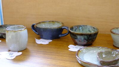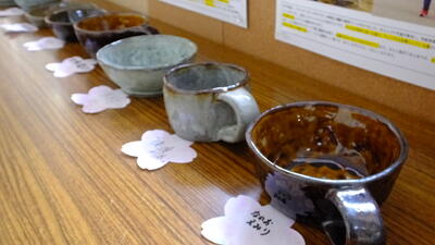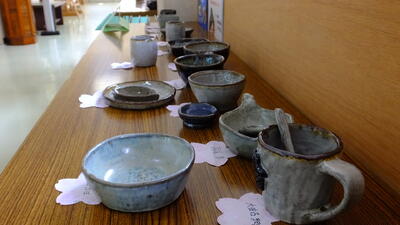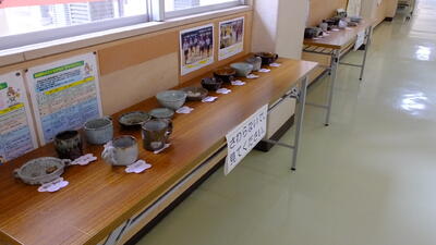 6年生は、陶芸教室で小代焼に挑戦しました。その作品ができあがり、3月4,5日の梅祭りの際に町役場に展示されました。6日㈪に学校に届きました。早速、廊下に展示しています。