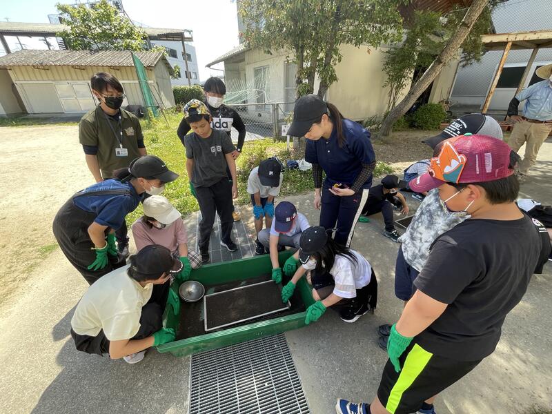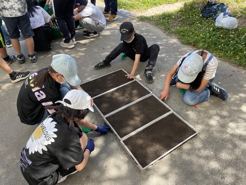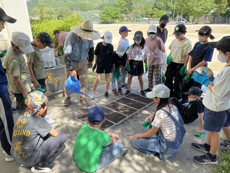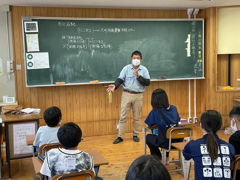 10日(水)5年生は、原農場の原様、森様、南関町役場経済課の戸上様、美川様、地域学校協働活動コーディネーターの田中様のご協力とご指導のもと、「種もみまき」に挑戦しました。
