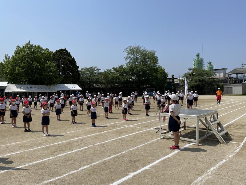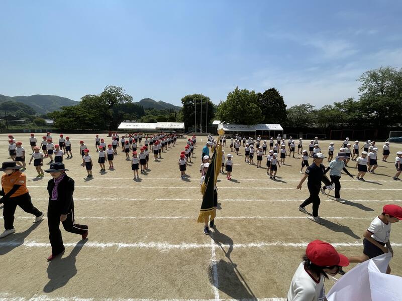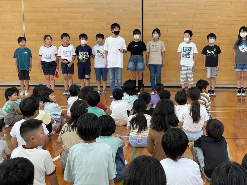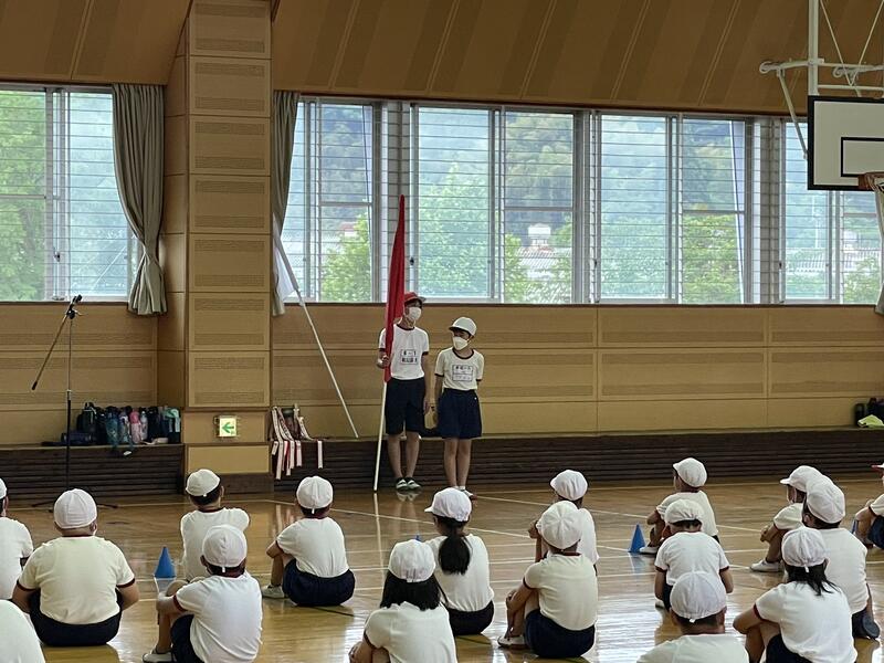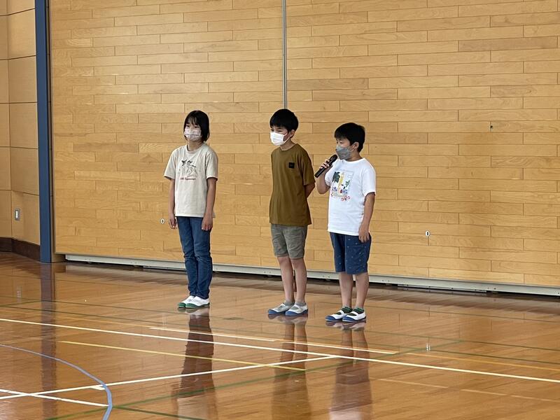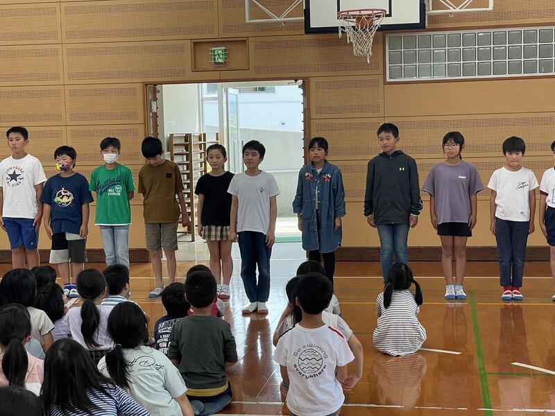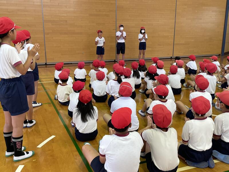 今年度の運動会スローガン「思い出が 笑顔で あふれる 運動会」発表の後、