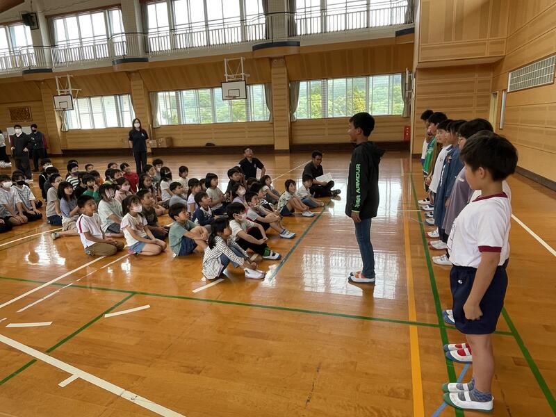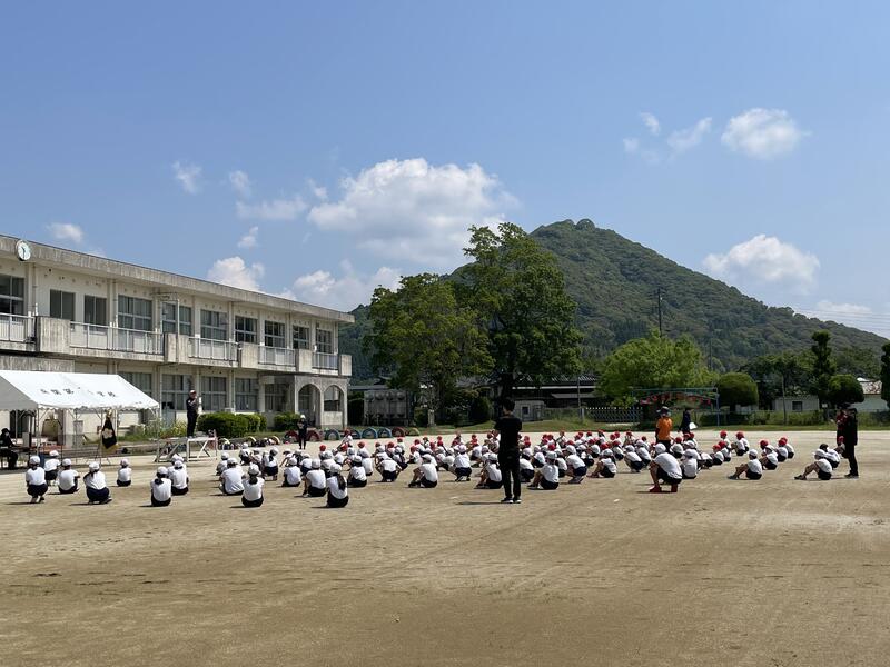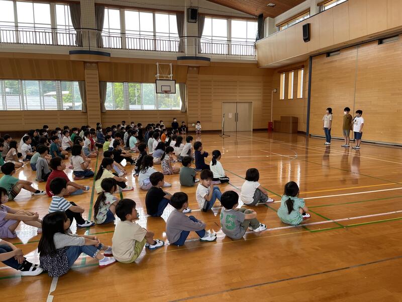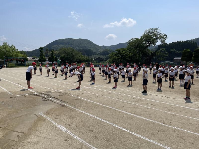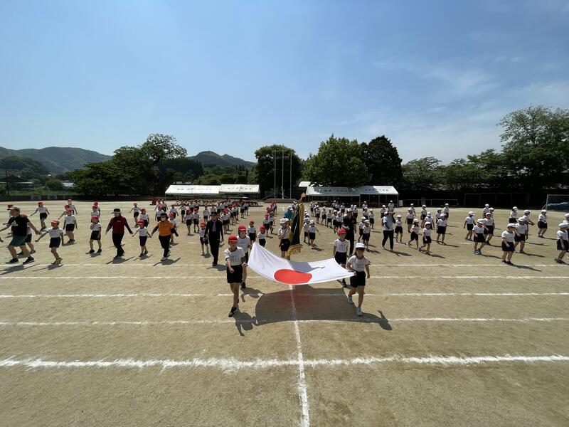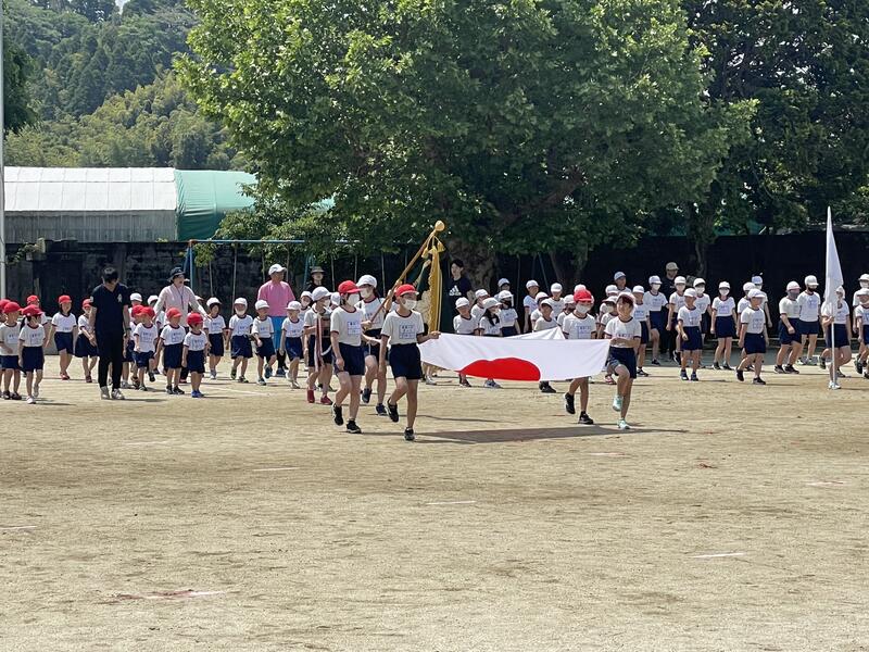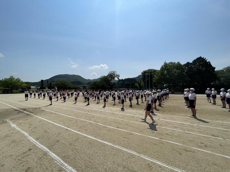 今年度の運動会スローガン「思い出が 笑顔で あふれる 運動会」発表の後、