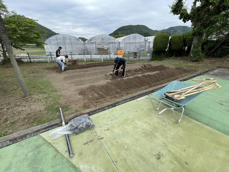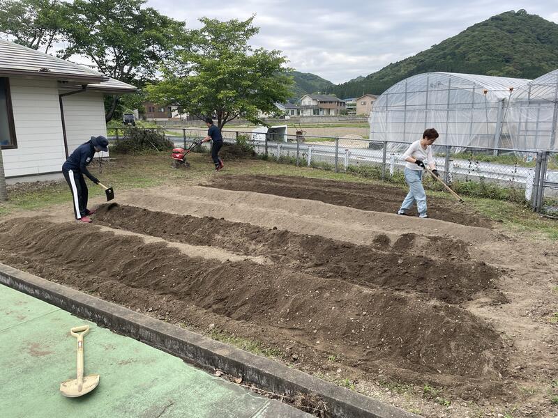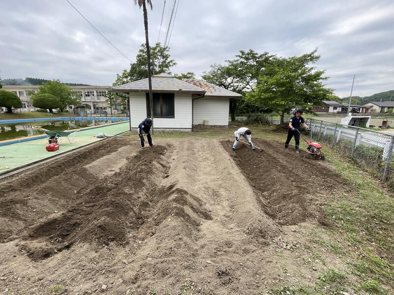 今日の放課後、さつまいも畑のうねづくりを保護者のみなさんと担任の先生方ががんばりました。
