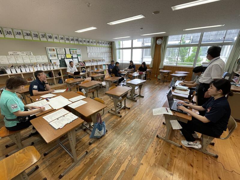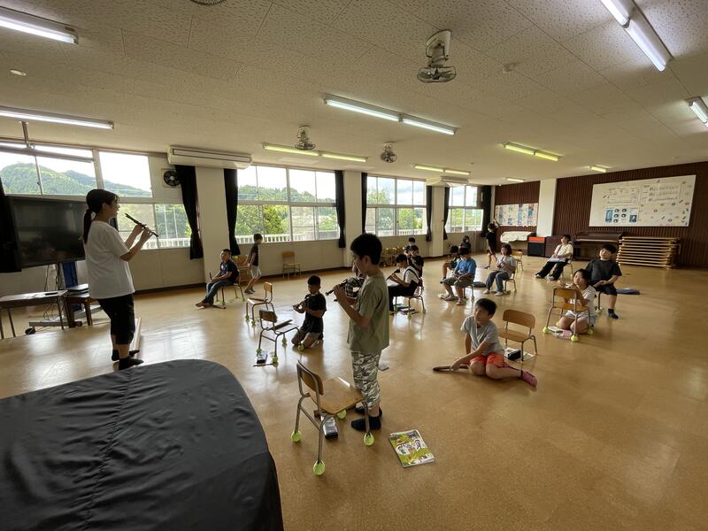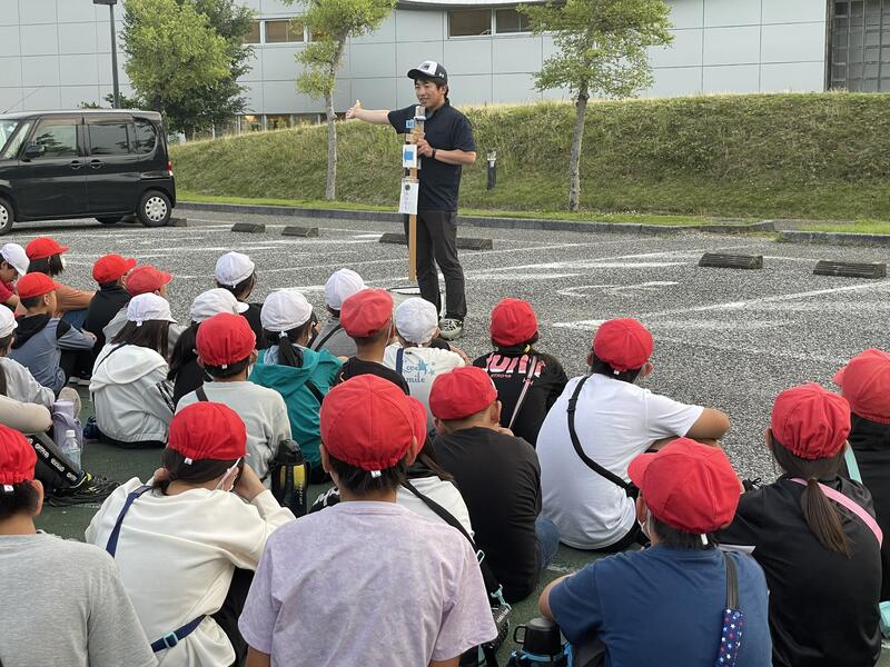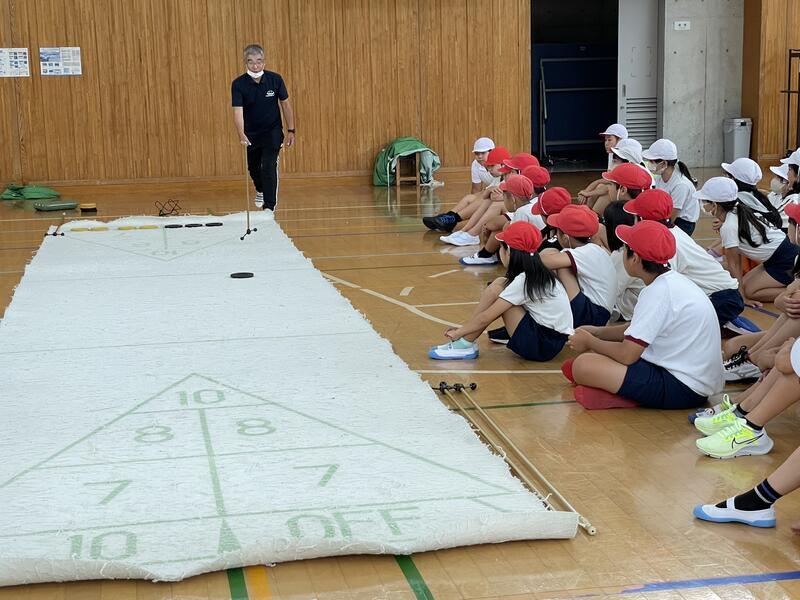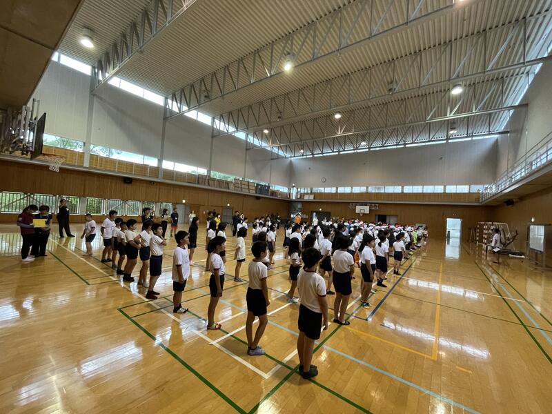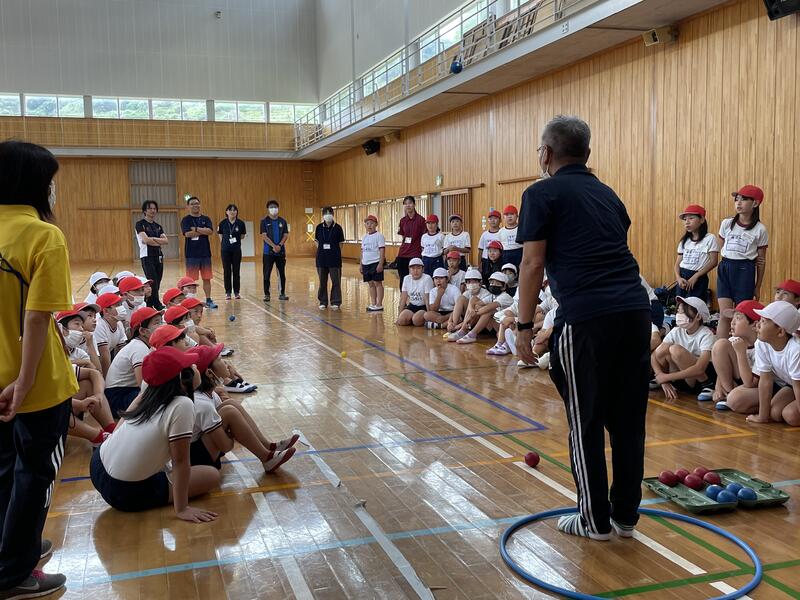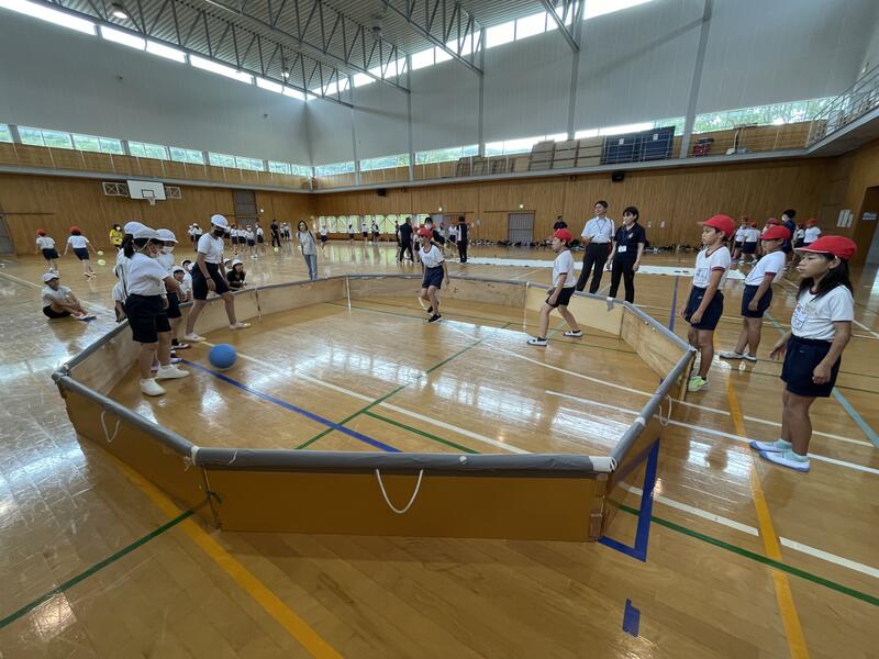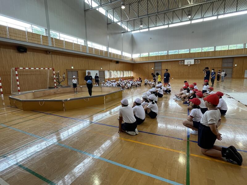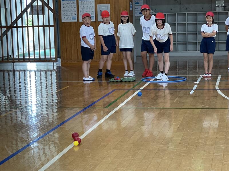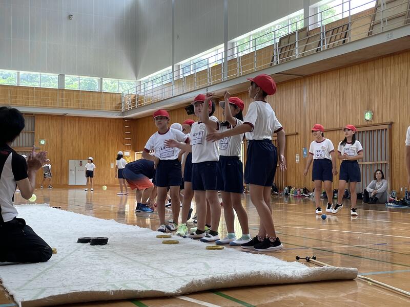 風がとても強くペーロン船での活動ができないため、体育館でニュースポーツをすることになりました。