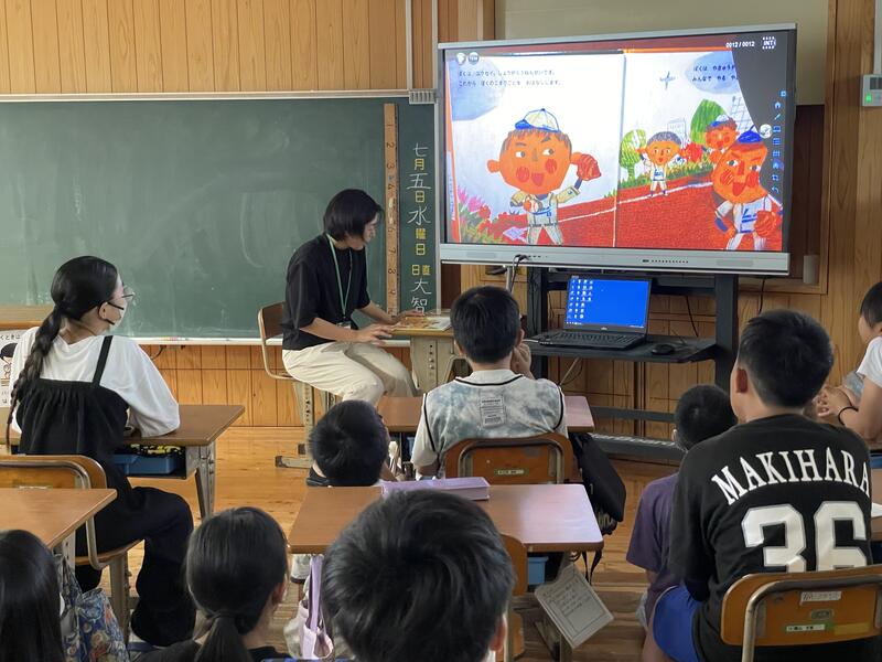 読み聞かせとふれあい訪問、のぼり旗取り付け