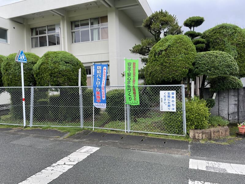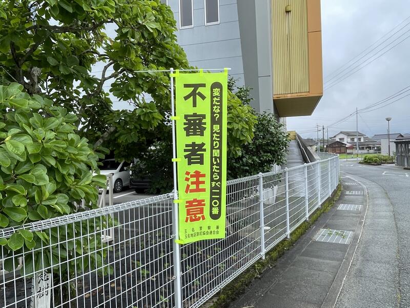 校門横には、防犯用ののぼり旗を事務の先生が取り付けてくれました。
