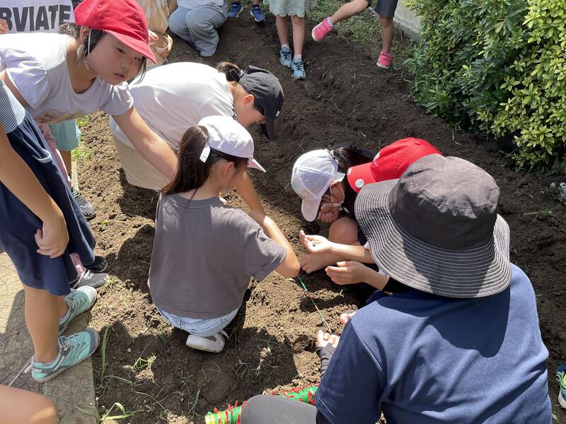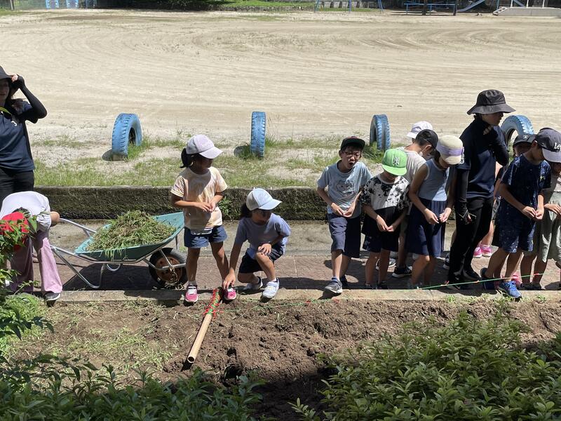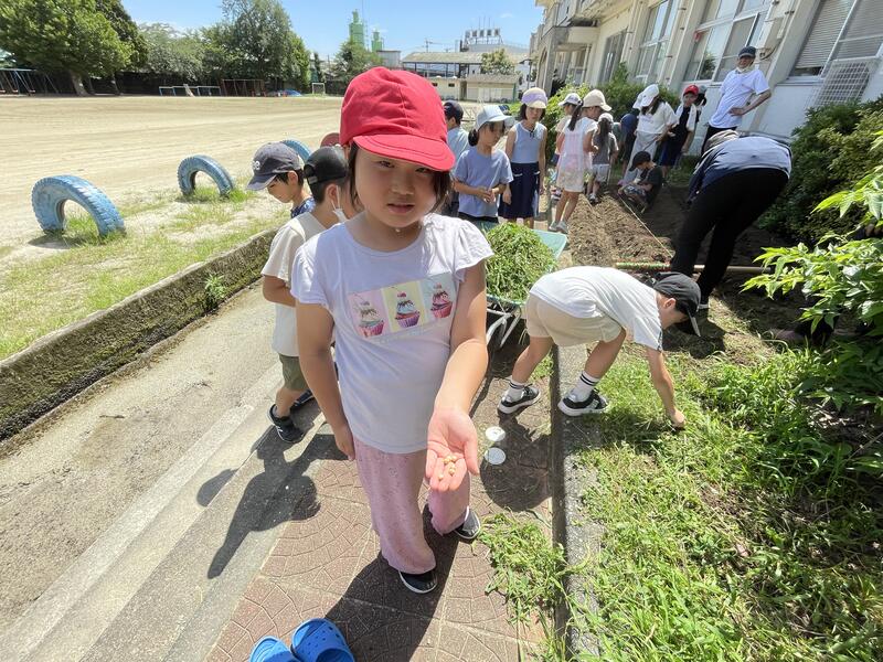 今日の午後から3年生は、丸美屋の芥川様に講師としておいでいただき、大豆のたねまきを行いました。