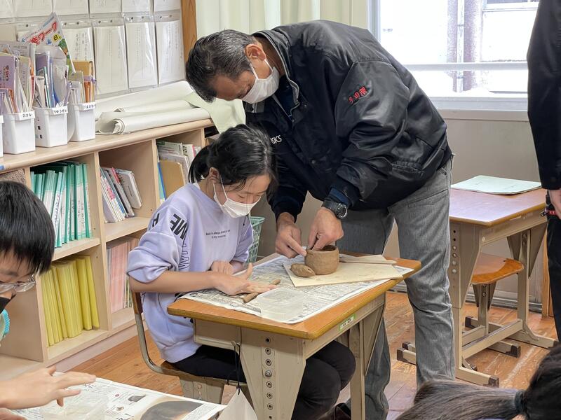 今日は「まもる窯」の徳永様、「野田窯」の野田様を講師としてお招きし、6年生で陶芸教室が行われました。