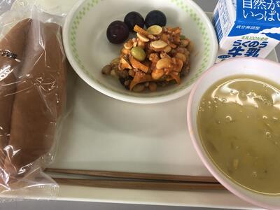 今日のメニューは、コッペパン、牛乳、コーンスープ、チリコンカン、ぶどうです。