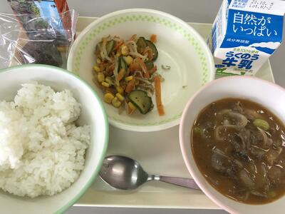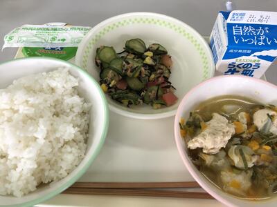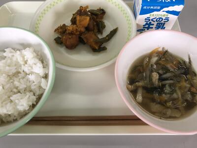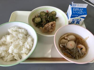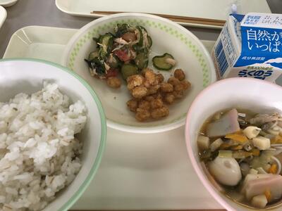 今日は、ひじきが入ったサラダでした。ひじきは漢字で書くとある動物の名前が入っていますが知っていますか?答えは、しかです。ひじきの形が鹿のしっぽににているからついたといわれています。ひじきには、私たちの血のもとになる鉄、骨のもとになるカルシウムがたくさん入っています。成長期である小学生の時期はぜひ食べていただきたい食材です。キャベツと肉団子のスープの肉団子は、ショウガがたっぷり入った手作りの肉団子でした。とってもおいしかったですよ!