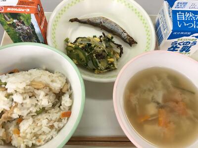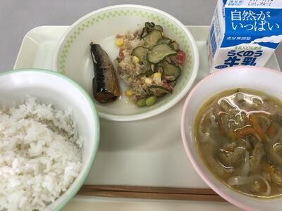 今日のメニューは、ふしそうめんの味噌汁、いわしかぼすレモン煮、ごまドレッシングサラダ、麦ご飯、牛乳です。
