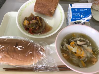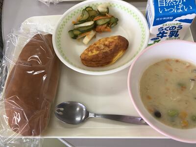 今日のメニューは、コッペパン、牛乳、きのこのポタージュ、オムレツ、なしサラダです。
