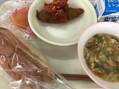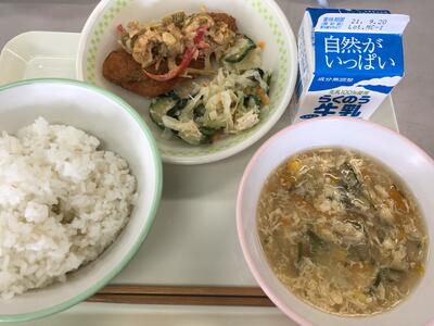 今日のメニューは、たまごスープ、魚のオーロラソース、チキンのごまだれ、麦ごはん、牛乳です。