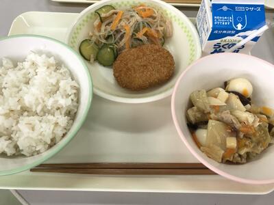 今日は、久しぶりにコロッケです。コロッケは明治時代に西洋から伝わった料理です。それは、牛乳で作ったソースで作るクリームコロッケでした。日本では安く手に入るジャガイモや挽肉、タマネギを使って、ポテトコロッケがうまれました。日本独自の料理として親しまれるようになりました。今日は、今から安くておいしくなるさといもを使ったコロッケです。さといもの粘りを生かしてつくられます。ごはんにあう味付けになっていました。