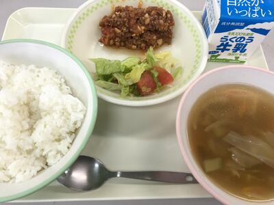 今日はタコライスです。ごはんの上にレタス・トマトとミートソースをかけて食べました。タコライスは、メキシコ料理「タコス」の具をごはんの上にのせた料理ですが、タコライスはどこで生まれた料理だと思いますか?正解は沖縄県です。今からおよそ35年くらい前に誕生したといわれています。30年前から沖縄の学校給食にも採用されているそうです。ビーンズスープも野菜と豆の出汁がしっかり出ていてとってもおいしかったです。いつもおいしい給食をありがとうございます。