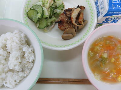 今日のメニューは、コンソメスープ、煮込みハンバーグ、りんごサラダ、麦ご飯、牛乳です。