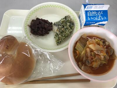 今日のメニューは、きのこと白菜のスープ、チャプチェ、きなこ豆、麦ご飯、牛乳です。