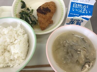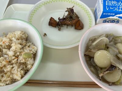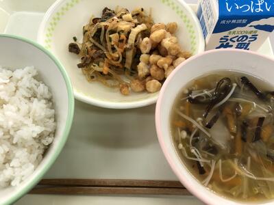 きのこのスープには、えのきたけときくらげがはいっていました。えのきたけは、きのこの中でも特に疲れを回復する効果があるそうです。今日の給食みたいに、スープや鍋などのいろいろな料理にいれていただきたいですね。チャプチェは韓国料理です。きなこ豆は大豆を揚げて、きなこと砂糖で味付けしてあり、おやつみたいでとってもおいしかったです。大豆なのに衣をつけて揚げることで、柔らかくなっていました。今日も残さずおいしくいただきました。給食センターのみなさん、いつもおいしい給食をありがとうございます。