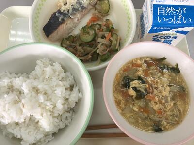 今日のメニューは、コーン入りたまごスープ、マーボーなす、デザート、ごはん、牛乳です。