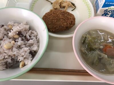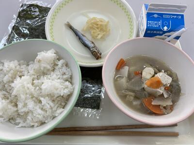 今日のメニューは、栄養五色ごはん、すいとん、さつまいもと小魚の揚げ煮、牛乳です。