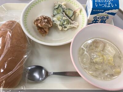 今日のメニューは、コッペパン、冬野菜の具だくさん豆乳チャウダー、鶏の唐揚げ、ポテトサラダ、牛乳です。