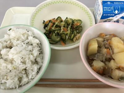 今日のメニューは、いりこなめし、じゃがいものそぼろ煮、南関揚げの酢の物、牛乳です。