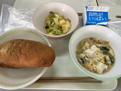 今日のメニューは、揚げパン、中華スープ、フレンチサラダ、牛乳です。