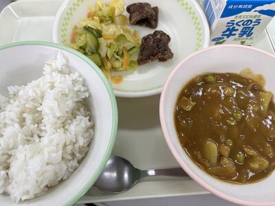 今日のメニューは、ポークカレー、くじらの竜田揚げ、キャベツの甘酢、牛乳です。