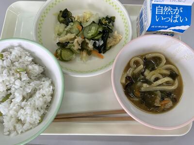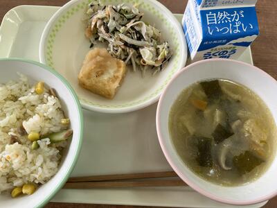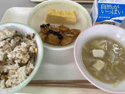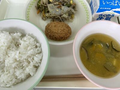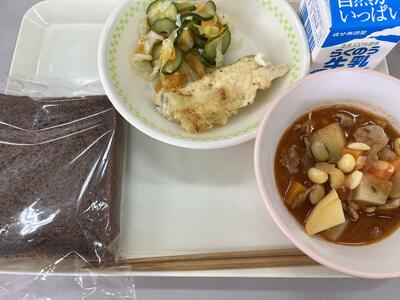きょうは、バラバラかきあげでした。ちくわ・なす・ごぼう・にんじん・たまねぎの5つの素材を1種類ずつ揚げて、素材の味がひきたつ料理でした。主食はまぜごはんでした。じゃがいもやしいたけが入り栄養満点です。手間がかかったおいしい料理をありがとうございます。